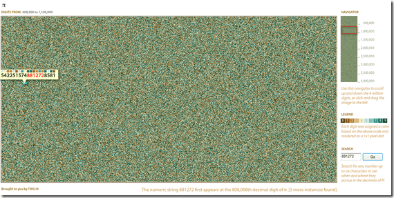 How about giving each digit a different colour and then allowing people to search for the numbers, that’s what the people at TWO-N have done. It’s surprisingly good fun searching for significant number combinations and realising that because Pi is so random it’s almost inevitable that they are there somewhere (even if it’s not in the first 4 million). The screen shot below shows part of my mobile phone number which appears at the 808,068th decimal place, my birthday doesn’t appear until the 263,000’s: