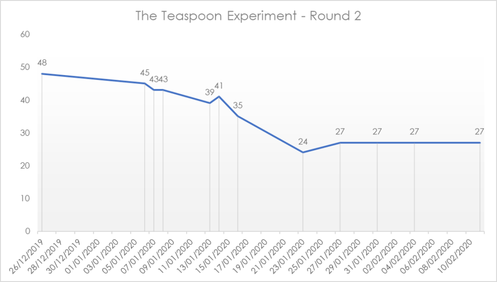 The scientific method is there for a reason, the implications of messing with it were obvious in this case. I will keep an eye on teaspoon numbers to see if anything changes, but perhaps it’s time to move on to something else.